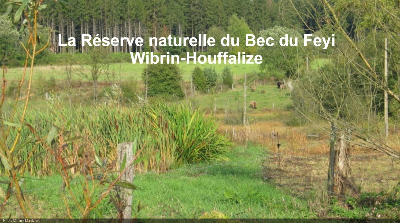 Située en Ardenne à mi-chemin entre La Roche et Houffalize, au nord du petit village de Wibrin, la réserve naturelle du Bec du Feyi couvre une dizaine d’hectares, sur le versant méridional du plateau des Tailles. Le site se présente actuellement comme une clairière au relief vallonné occupée par une ancienne ferme dont les terres furent exploitées de façon extensive tout au long du 20e siècle. Il s’agit d’une zone humide de grand intérêt écologique sur le plan régional. Les biotopes y sont fort bien préservés et d’une belle diversité : prés de fauche, pâture, prairies marécageuses, lande à callune et myrille, etc. Plusieurs étangs oligotrophes hébergent une faune aquatique remarquable comprenant une vingtaine d’espèces de libellules ainsi que d’extraordinaires populations d’amphibiens. L’un de ces étangs abrite par ailleurs une ceinture de trèfle d’eau (Menyanthes trifoliata) dont l’ampleur est assez exceptionnelle. Cependant, si toutes ces richesses sont à présent protégées, il s’est fallu de peu que le site ne soit englouti, durant les années septante, par un village de vacance avec piscines et terrain de tennis !